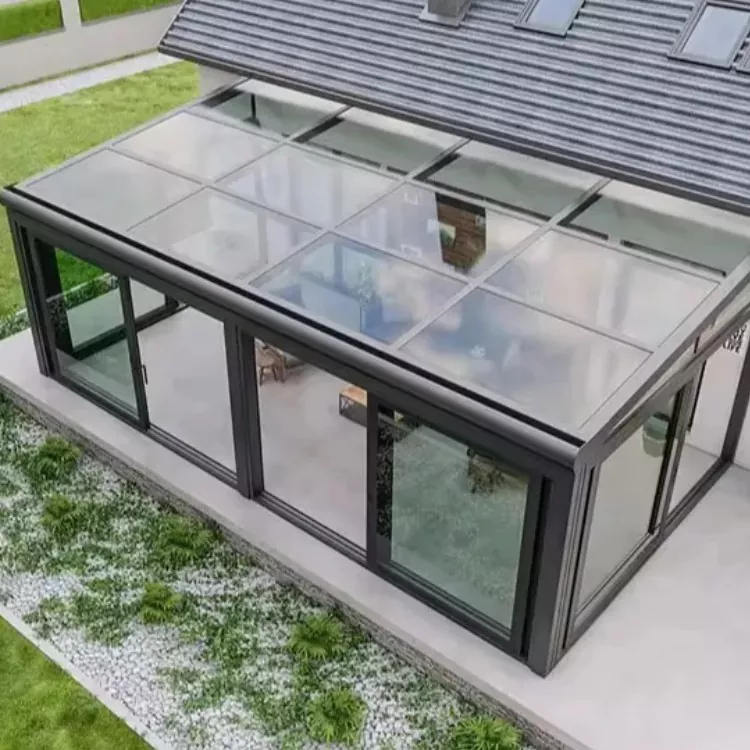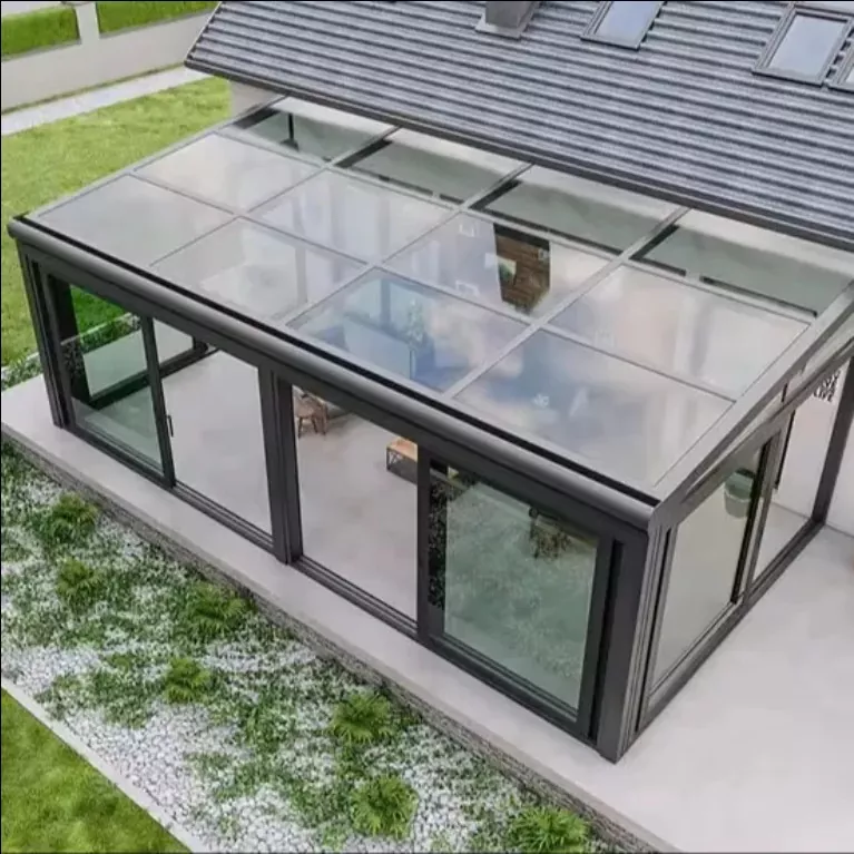 · Penyesuaian Kustomisasi : Ndhukung wangun sing disesuaikan kayata atap sing mlengkung, miring lan rata, kanthi macem-macem pilihan warna pigura kalebu frosted, emas sampanye lan kopi, sing bisa cocog karo gaya arsitektur saka macem-macem skenario kayata teras vila, area luang pelataran lan ruang pendukung komersial, nggayuh kesatuan estetika lan praktis.